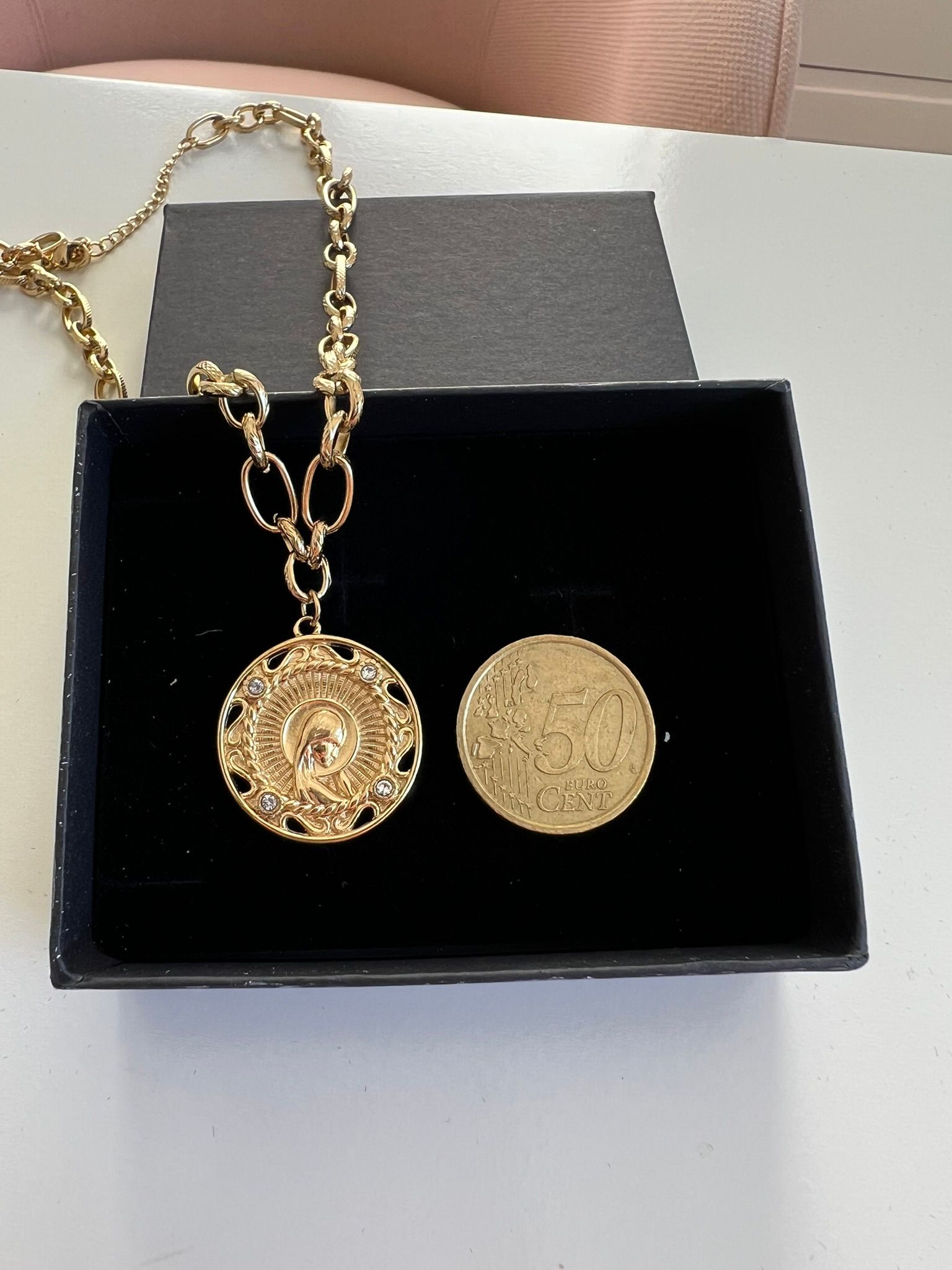 Tanto la medalla como la cadena son de acero inoxidable 316L (también conocido como acero quirúrgico) con baño de oro de 24k.