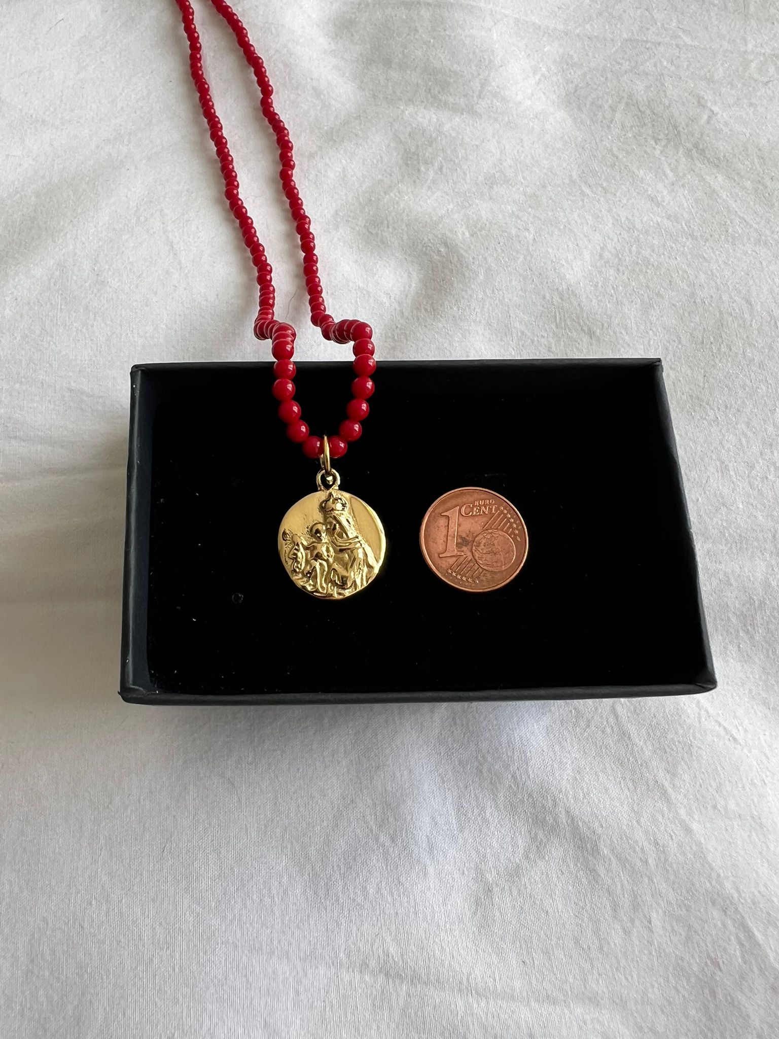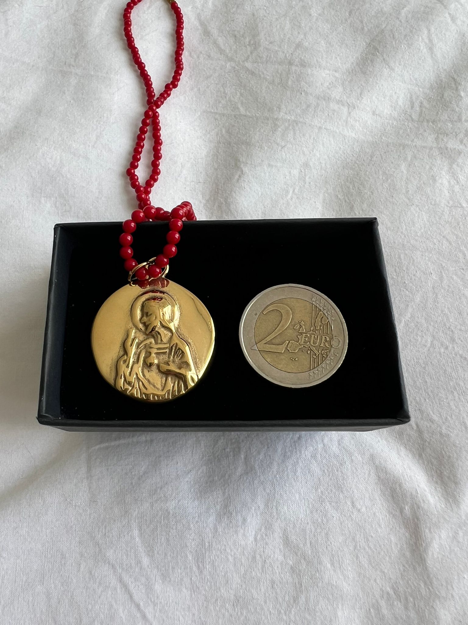 Collar de coral auténtico rojo con medalla escapulario estilo clásico con relieve de la Virgen del Carmen por un lado y el Corazón de Jesús por el otro en acero inoxidable dorado.