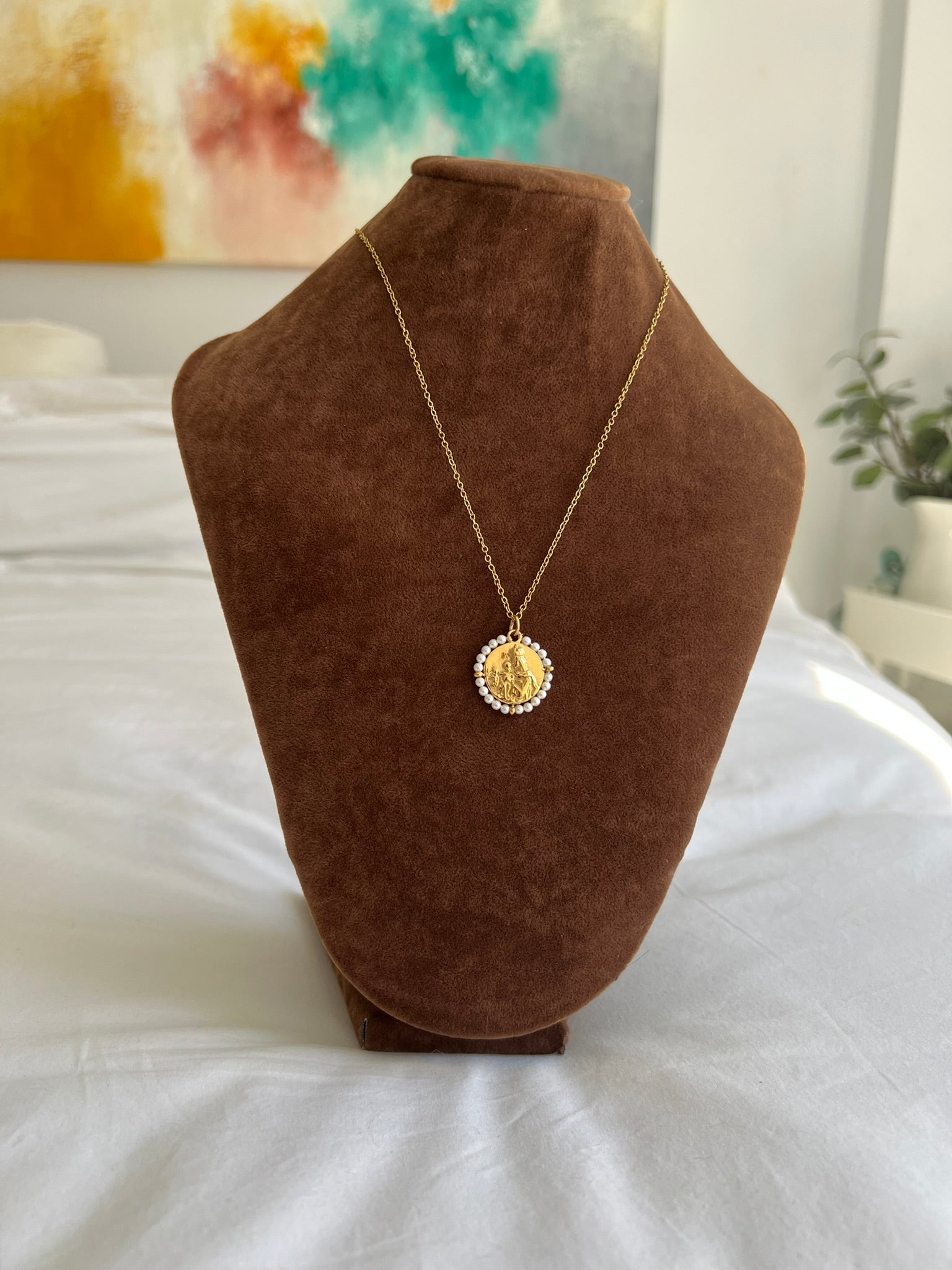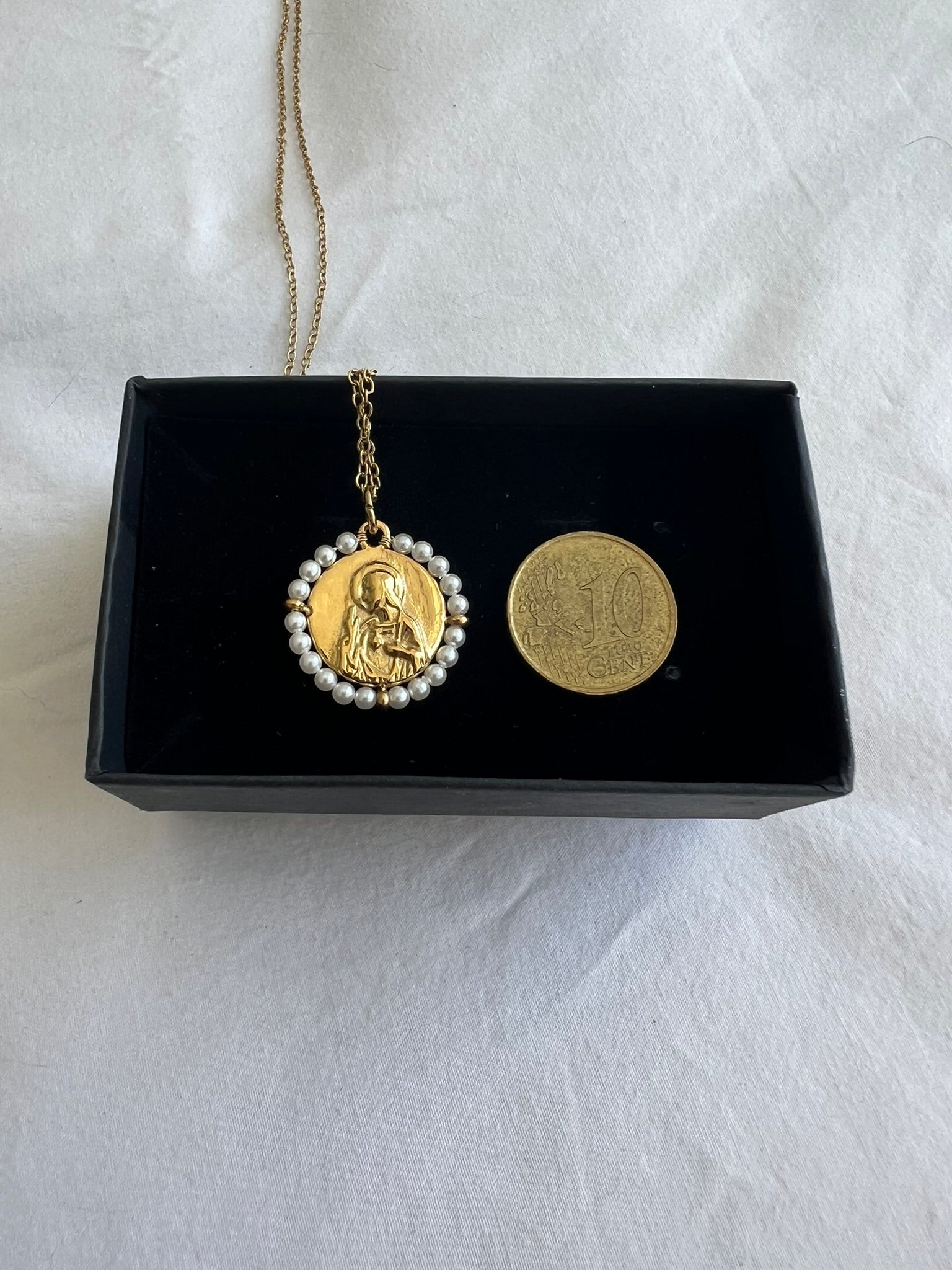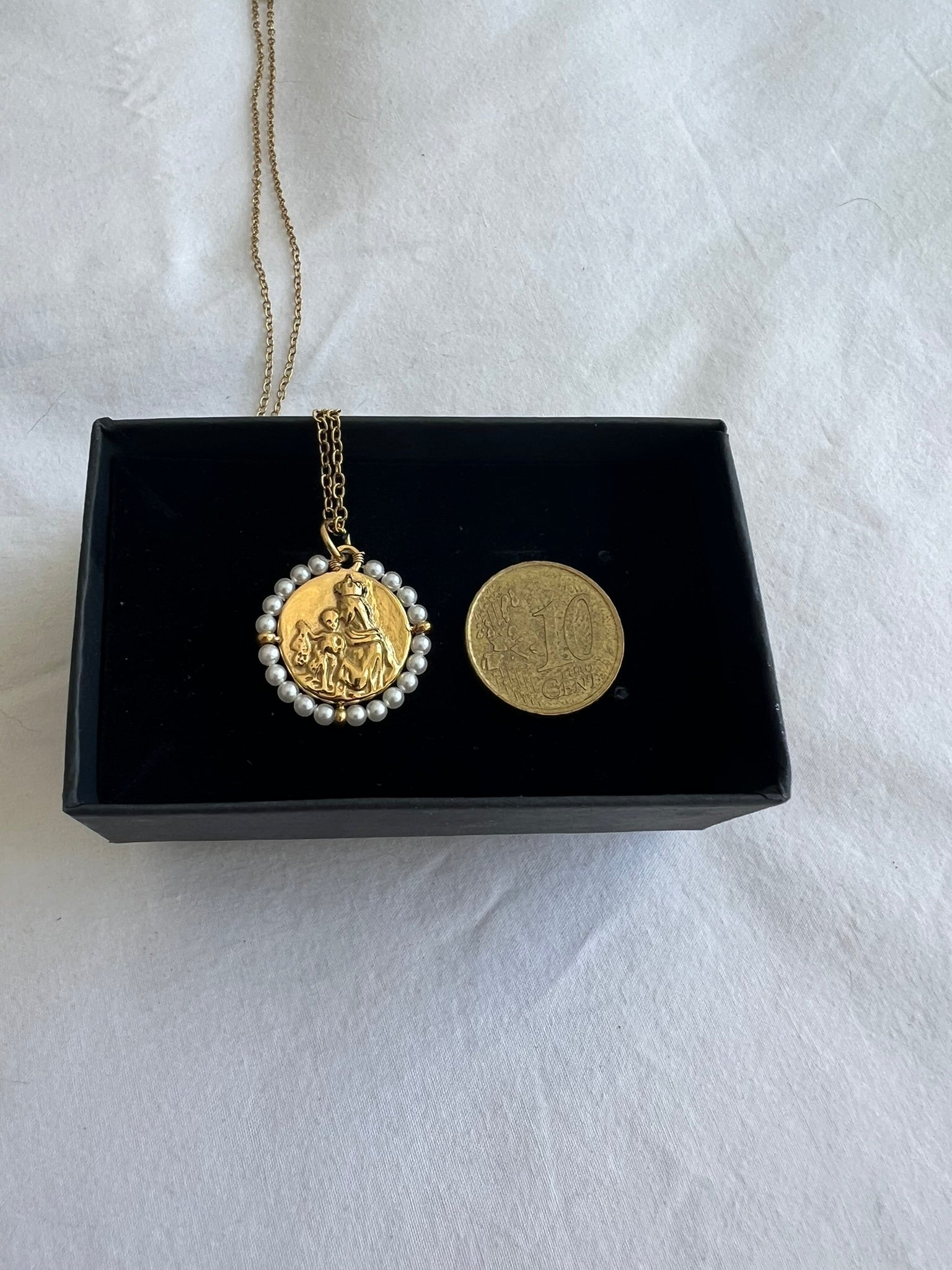 La medalla tiene 1cm de diámetro, un poco menor que una moneda de 10 céntimos. La cadena mide 42cm + extensor de 5cm.