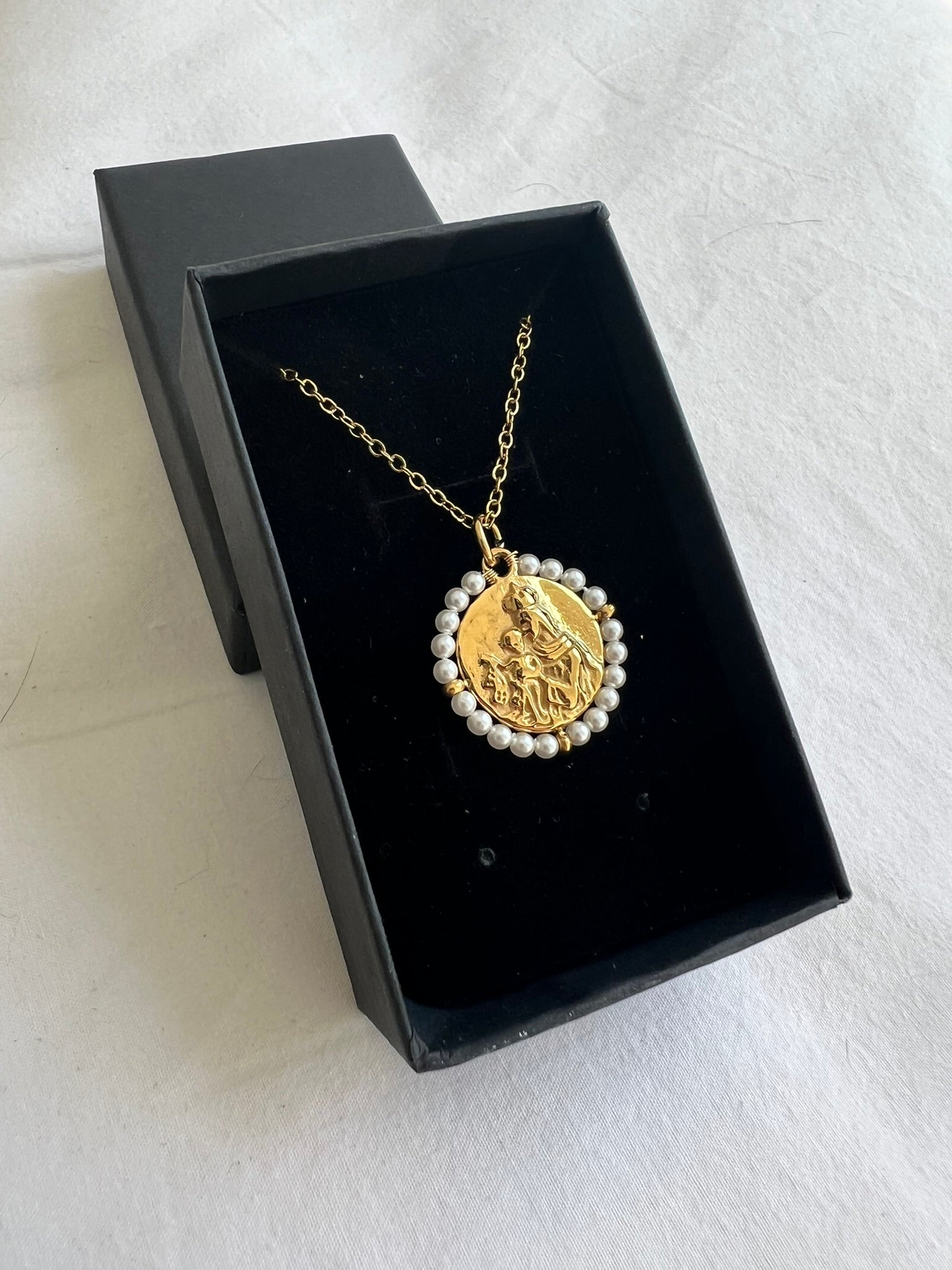Medalla escapulario estilo clásico con relieve de la Virgen del Carmen por un lado y el Corazón de Jesús por el otro en acero inoxidable dorado con contorno de perlas.
