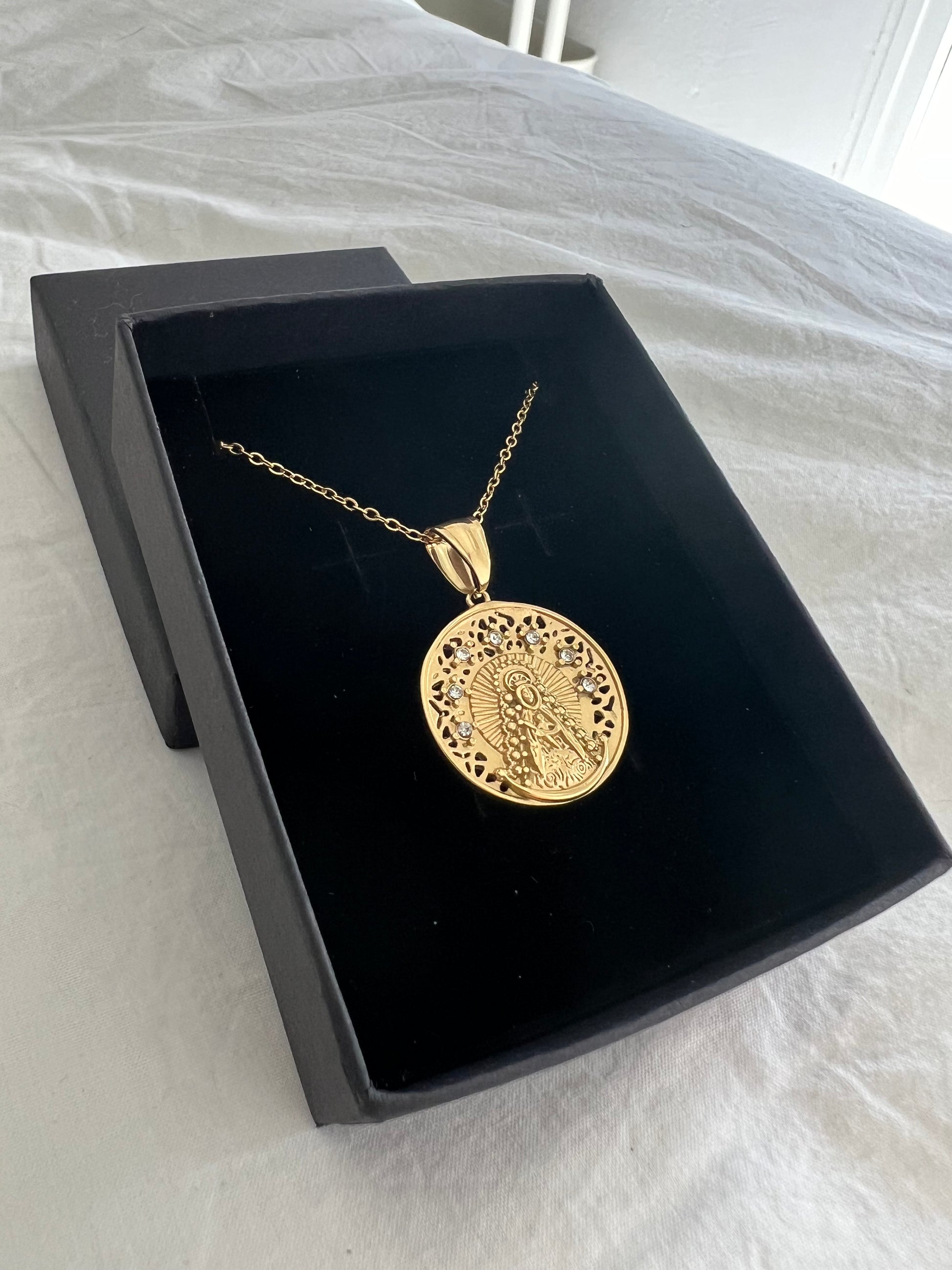 Medalla de la Virgen del Rocío enmarcada en una celosía decorada con siete circonitas en acero inoxidable con baño de oro de 24k. Tiene 25mm de alto, el tamaño aproximado de una moneda de 50 céntimos.