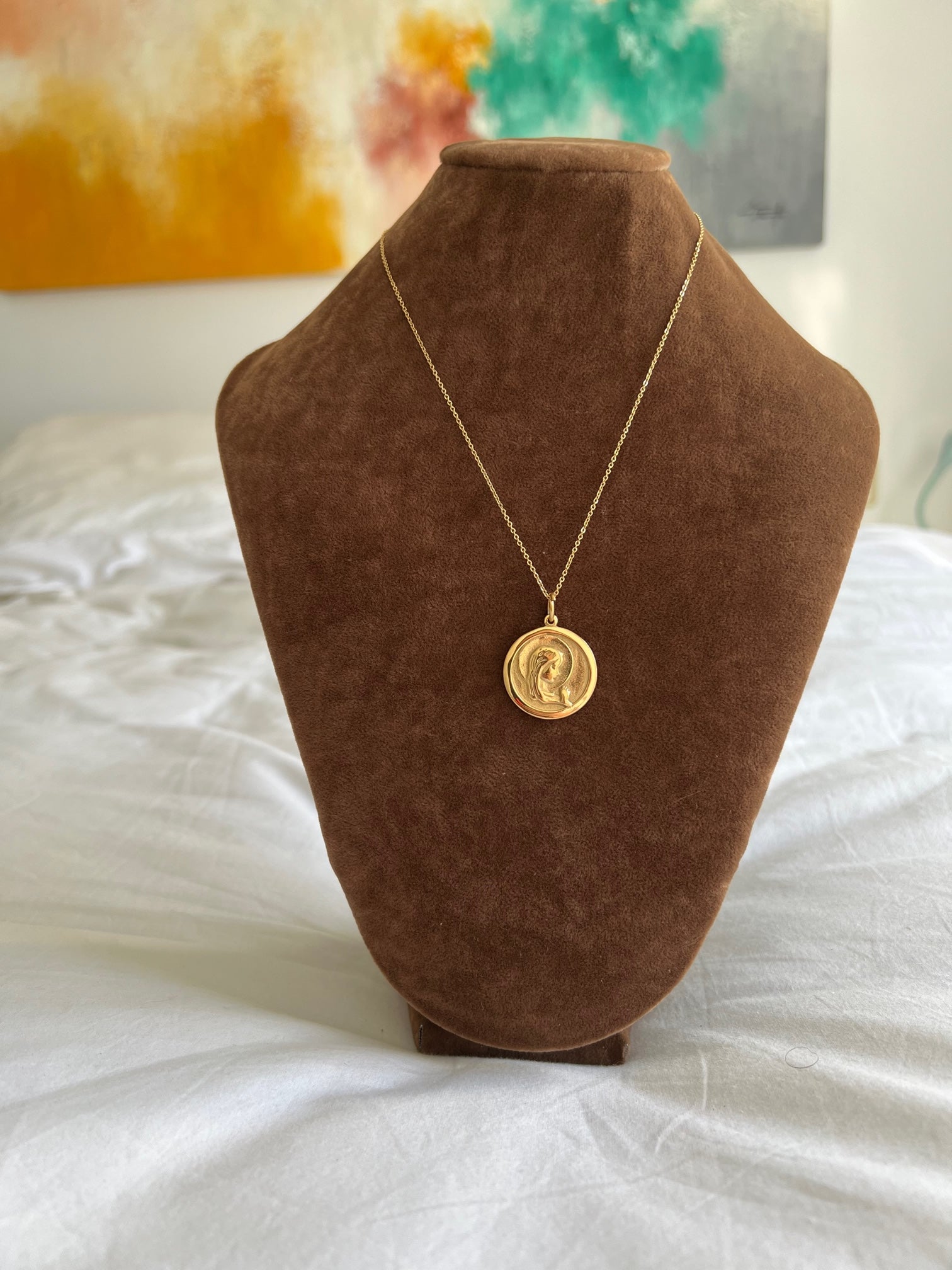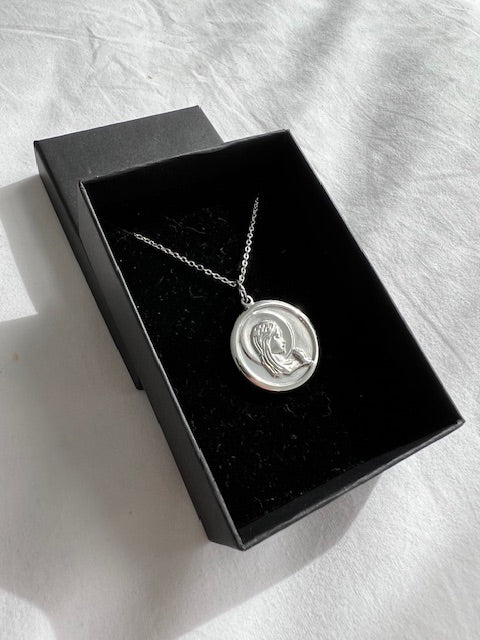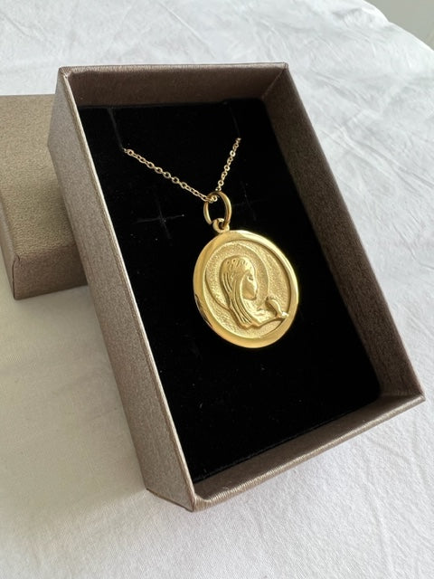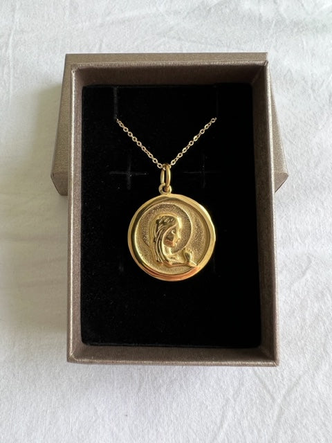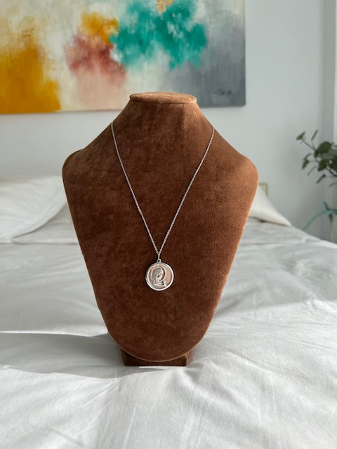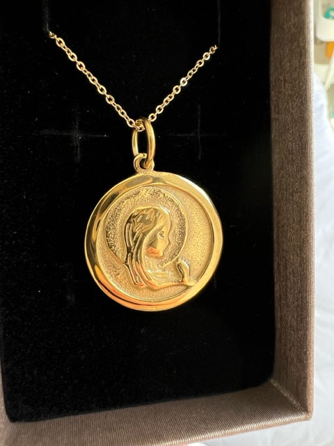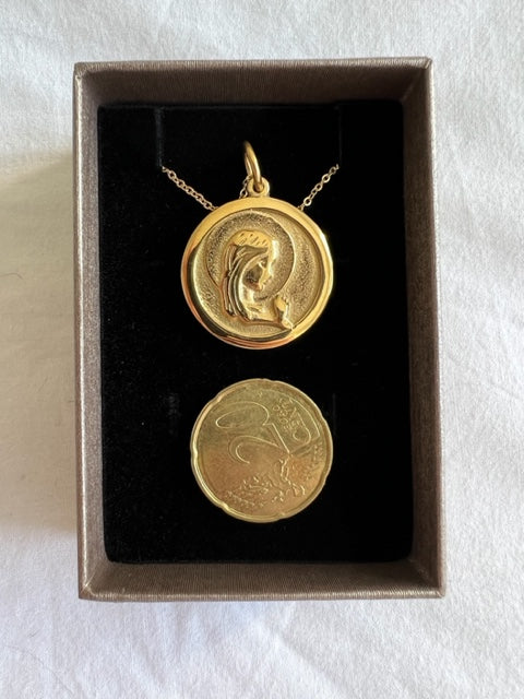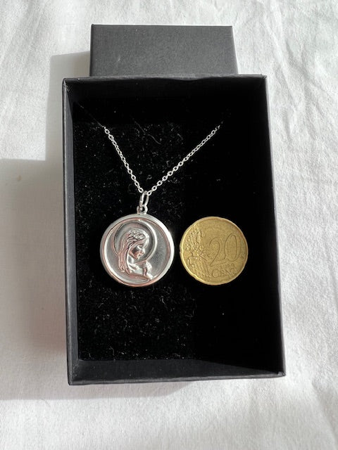 Medalla de la Virgen Niña en acero inoxidable. Tiene 23mm de diámetro, un poco mayor que una moneda de 20 céntimos.
