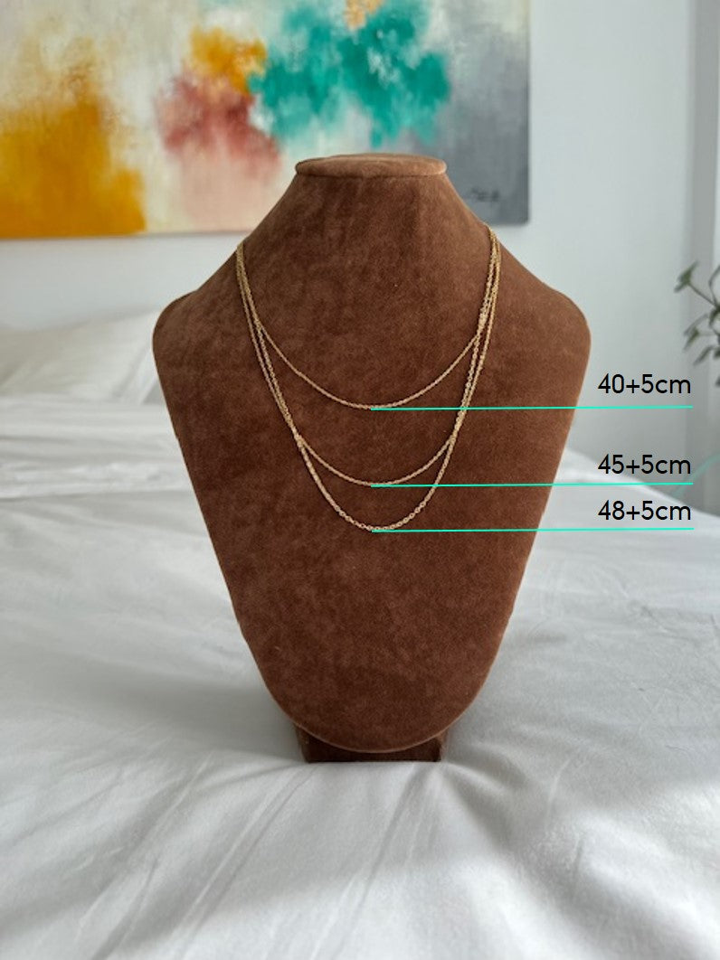 Incluye cadena simple con cierre de mosquetón disponible en varias medidas para que puedas elegir la longitud que más te guste.